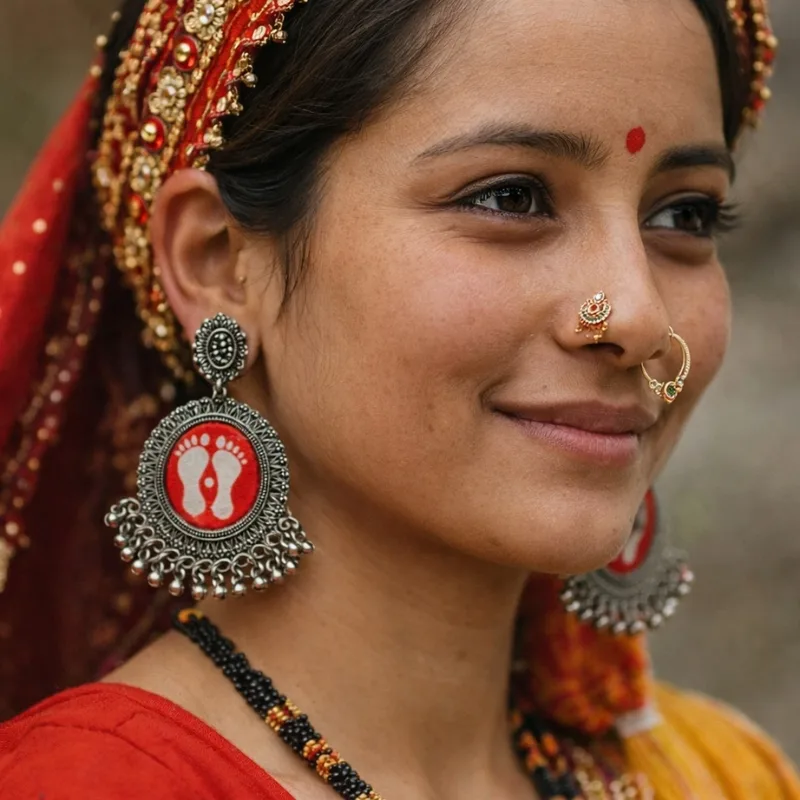 This exclusive combo includes two distinct Aipan-inspired jhumka designs, featuring sacred motifs such as Charan Paduka and Mandala patterns, symbolizing spirituality, prosperity, and cultural roots.
