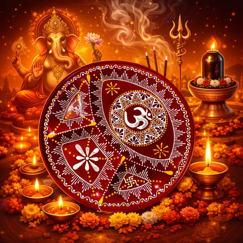 • Holding shankh, ghanti, chandan, teeka, chawal, diya, and flowers
