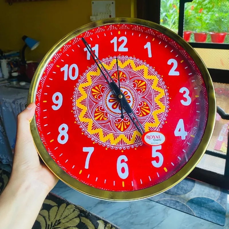 Every tick of this Handpainted Aipan Wall Clock carries the rhythm of Uttarakhand’s heritage. Inspired by the sacred Aipan art drawn on Kumaoni walls during festivals and rituals, each stroke on this clock is painted by hand — symbolizing prosperity and peace. Its vibrant red face and intricate white mandala patterns tell the story of devotion and tradition blending with modern living. Whether hung in your living room, study, or entrance, this 8–10 inch handmade timepiece doesn’t just show time — it connects you to a timeless art form that celebrates patience, culture, and craftsmanship.