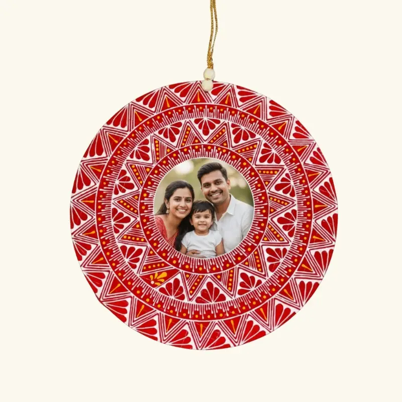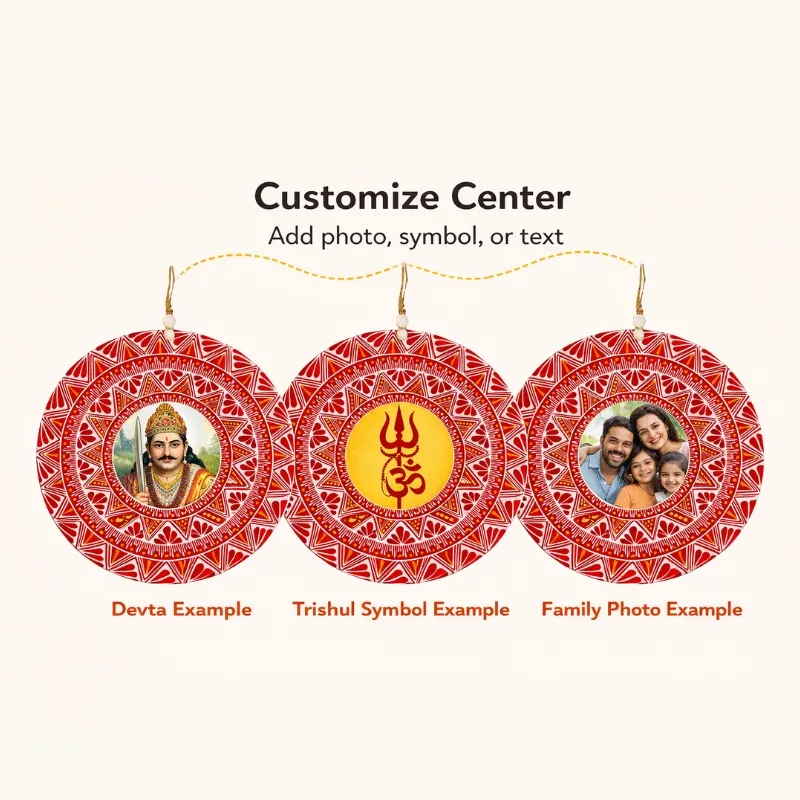 The center of the design can be customised with a photo, deity image, sacred symbol, name, or logo, making each piece truly unique. Crafted on a premium MDF base with vibrant, long-lasting colours, it is lightweight, durable, and comes with a strong hanging loop—ideal for pooja rooms, living spaces, offices, and gifting.