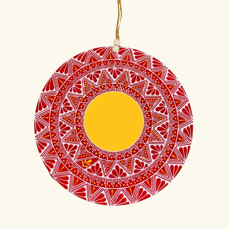 Bring home the sacred beauty of traditional Aipan art with a personalised touch. This handcrafted Aipan-inspired wall hanging features a detailed circular mandala in rich red tones, symbolising prosperity, protection, and positive energy, while preserving the cultural essence of Uttarakhand.