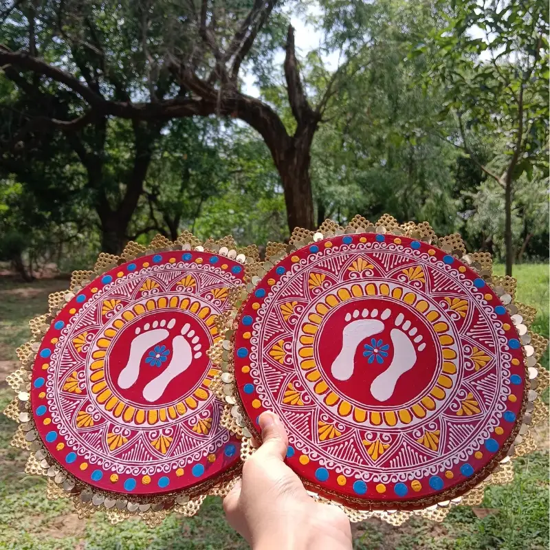 This beautifully handcrafted Aipan Wall Hanging features the traditional Lakshmi Charan motif, symbolizing prosperity, purity and divine blessings. Made on 8-inch premium MDF, the artwork showcases vibrant red, white, yellow and blue detailing, surrounded by a premium golden decorative border for a rich festive look.