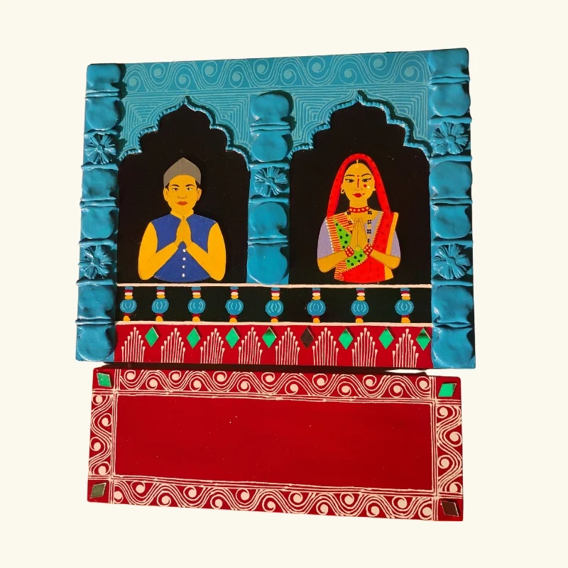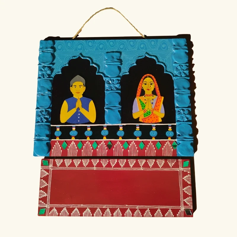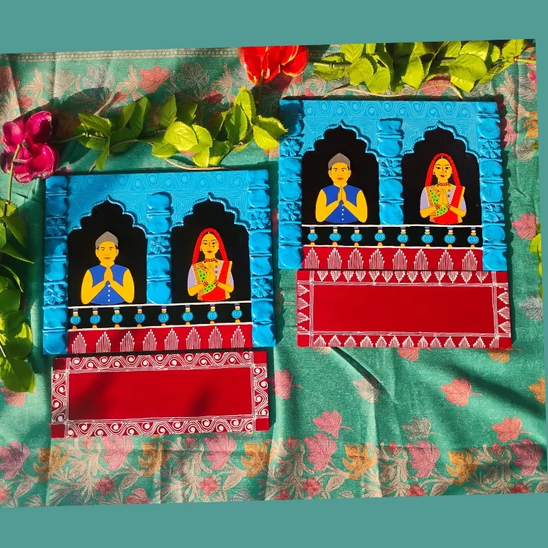 The artwork features a vibrant Pahadi jharokha design with a traditionally dressed couple greeting guests with folded hands — a symbol of Indian warmth, respect, and hospitality.